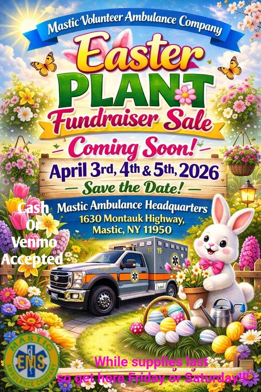Mastic Ambulance Company Easter Plant Sale Fundraiser! 🌷🐣 Join us as we welcome spring with a beautiful selection of flowers, hanging baskets, and seasonal plants — all while supporting your local volunteer EMS agency and the lifesaving services we provide to our community every day. 🗓 April 3rd, 4th & 5th, 2026 📍 Mastic Ambulance Headquarters 1630 Montauk Highway, Mastic 💳 Cash and Venmo gladly accepted