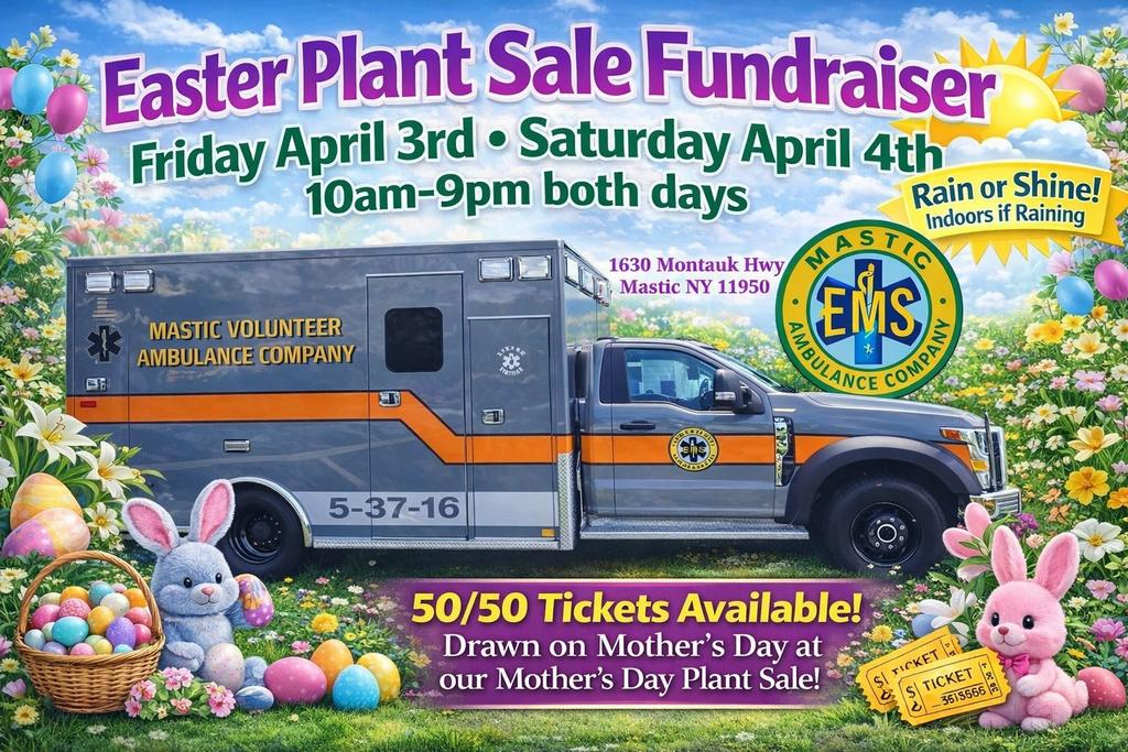 🌷🐰 Mastic Volunteer Ambulance Company’s Easter Plant Sale Fundraiser is almost here! 🐣🌼 Join us Friday, April 3rd and Saturday, April 4th from 10:00 AM – 9:00 PM both days at our headquarters, 1630 Montauk Highway, Mastic, NY 11950, for our annual Easter Plant Sale Fundraiser! Come pick up beautiful Easter flowers & spring plants just in time for the holiday while supporting your local volunteer ambulance company. 🎟 50/50 raffle tickets will also be available for purchase! The winning ticket will be drawn on Mother’s Day during our Mother’s Day Plant Sale fundraiser. 💵 Cash & Venmo gladly accepted ☔ Rain or shine — we will be indoors if raining! Thank you for always supporting your local volunteers. We look forward to seeing everyone there! 🚑🧡🌷